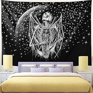 ブラックとホワイト スカル スケルトン アート 太陽の下 月 星空 タペストリー 壁アート 室内装飾 寝室 リビングルーム 寮の装飾タペストリー 60 x 51インチ
