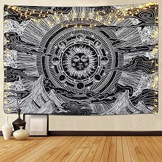 Sevenstars 太陽と月 タペストリー 燃える太陽 星 タペストリー サイケデリックタペストリー ブラックとホワイト 神秘的なタペストリー 壁掛け 59.1' x 59.1'