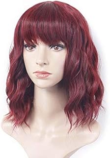Aideshair wave wig with air bangs women's short wine red wig curly wave synthetic cosplay girl colorful wig (Red wine)