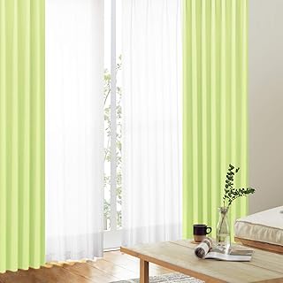 カーテンくれない「K-wave-D-plain」と「K-wave-L-high guard voile-ow」の4枚セット(遮光カーテン2枚 昼夜目隠しミラー効果ボイルレース2枚 計4枚) 【40色×140サイズ】 日本製 防炎 ウォッシャブル 防炎ラベル付き 遮熱 断熱 サイズ:幅125×丈80cm×4枚 色:シャイニーグリーン(2023)/ レース:オフホワイト(S-OW) / 丈:厚地より-2cm / Aフック